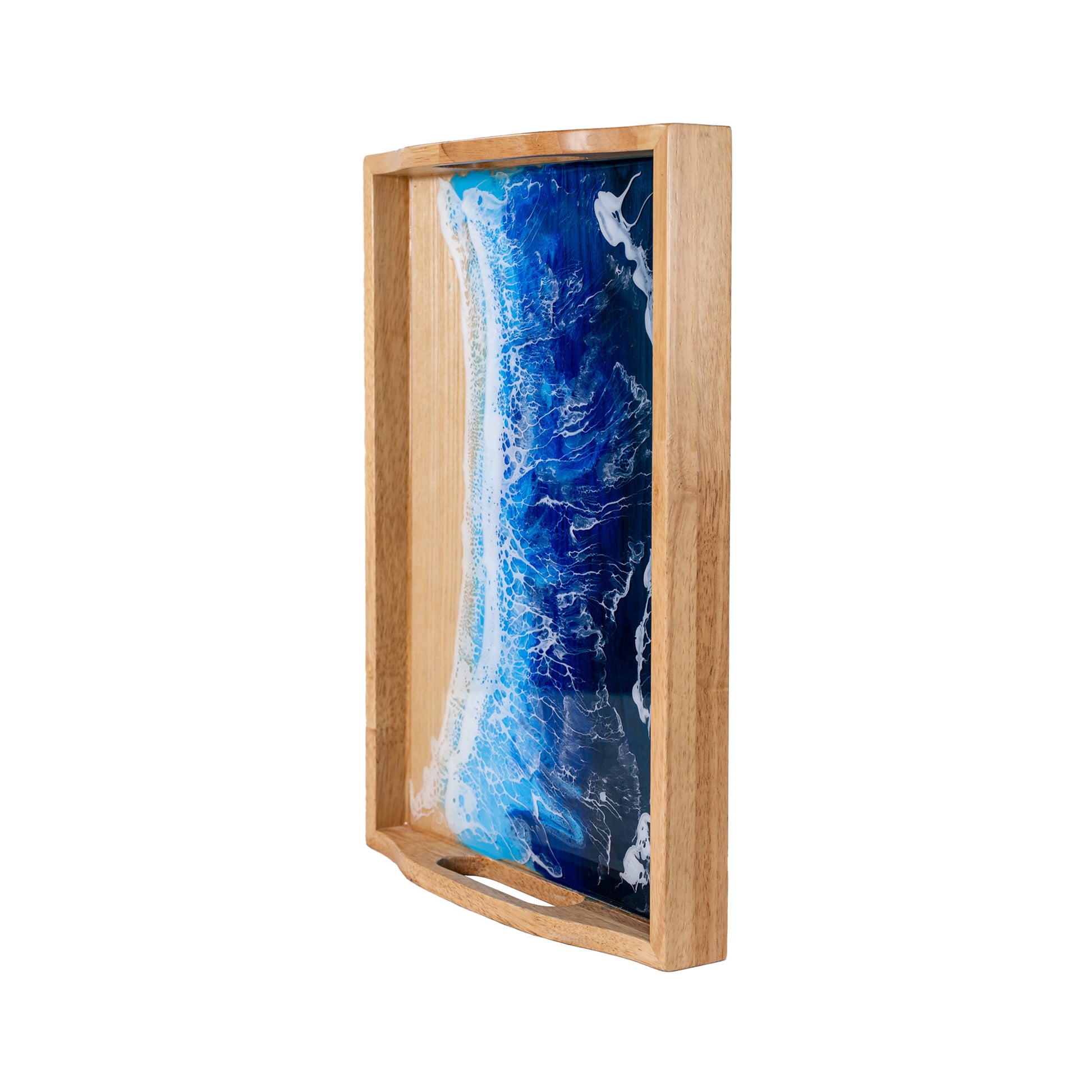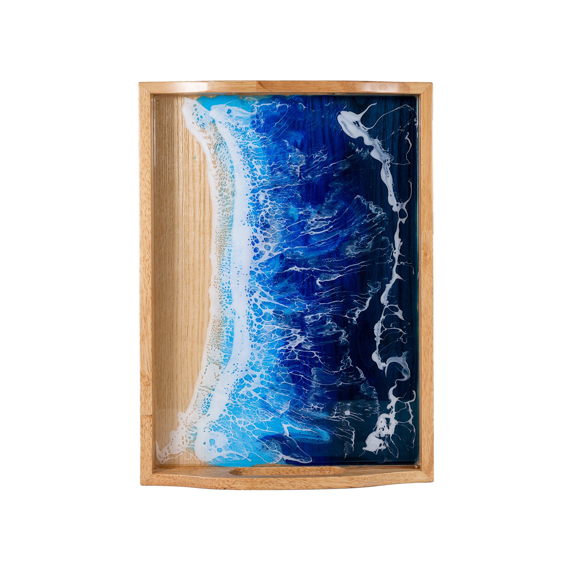 Inspired by the beauty of ocean waves, this handcrafted rectangular tray combines natural wood with artistic epoxy resin, creating a stunning visual flow of rich, diverse patterns. Each tray is a unique work of art, perfect for adding a coastal touch to your decor while serving drinks, fruit, or food on a plate. The waterproof finish and cutout handles ensure both style and functionality.