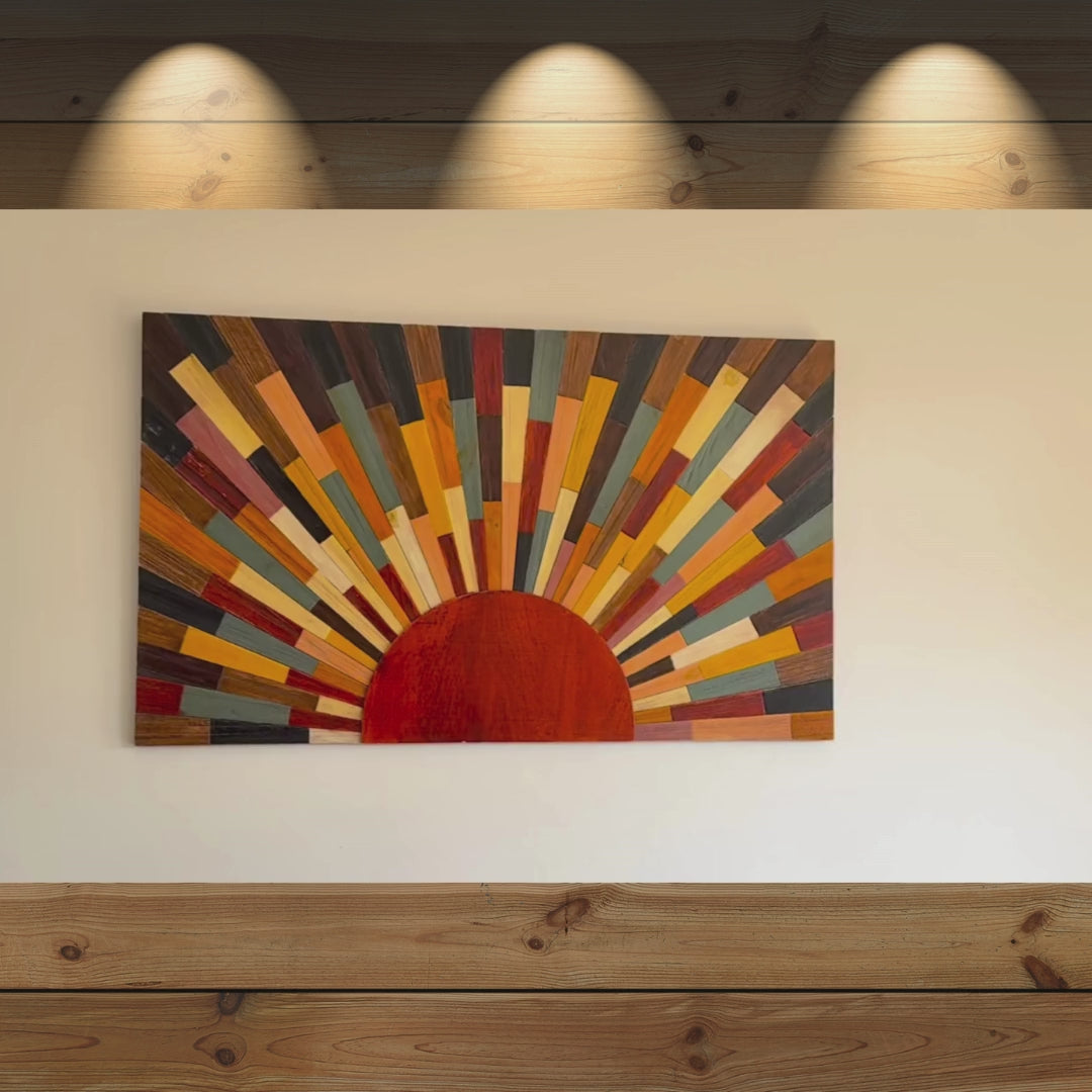 Experience the artistry of our handmade Sun Wood Painting, crafted from natural Pine wood and requiring exceptional skill. Each wooden slat is meticulously cut into precise squares, hand-glued with strong milk glue, and carefully pressed to ensure a flawless surface. The unique color scheme, designed by the artist, adds a stunning feature, with each bar hand-colored by skilled craftsmen over several days. This sophisticated piece showcases unparalleled craftsmanship and attention to detail, making it a standout addition to any space.